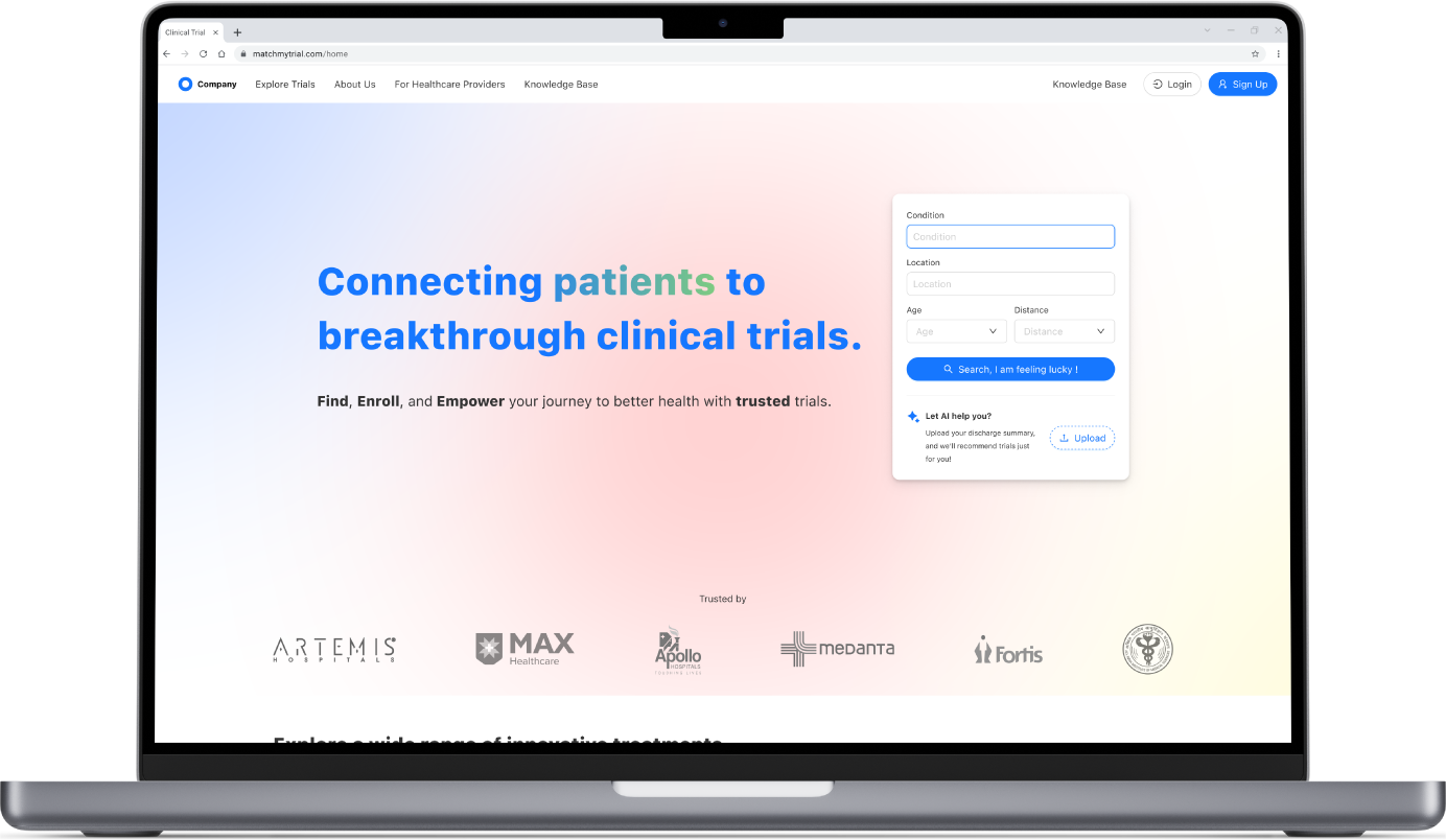 The Clinical Trial Platform bridges patients and healthcare professionals in India, simplifying trial discovery, enrollment, and participant management.